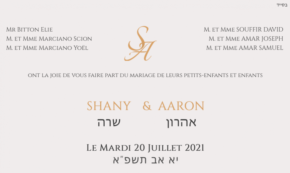 et seraient honorés de votre présence à la Houppa suivi de la réception à